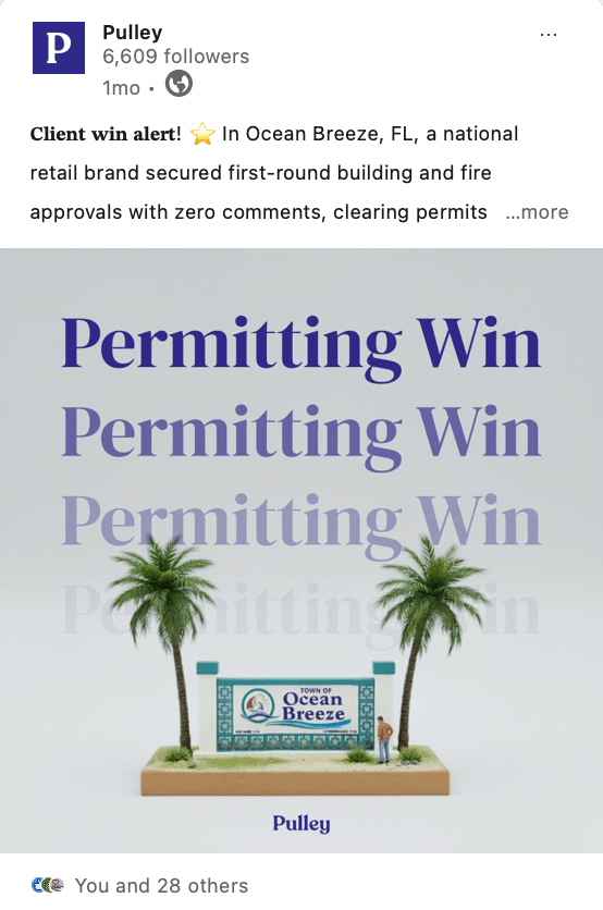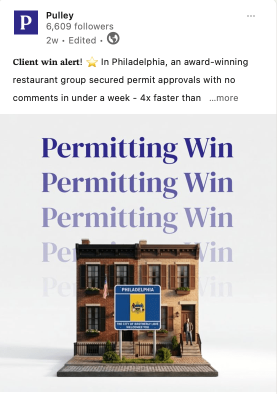 These posts were engineered to demonstrate Pulley’s core differentiator: human permitting expertise powered by purpose-built technology. In multiple sales conversations, prospects brought up win stories on their own, saying “We want those kinds of results we saw on your LinkedIn.”